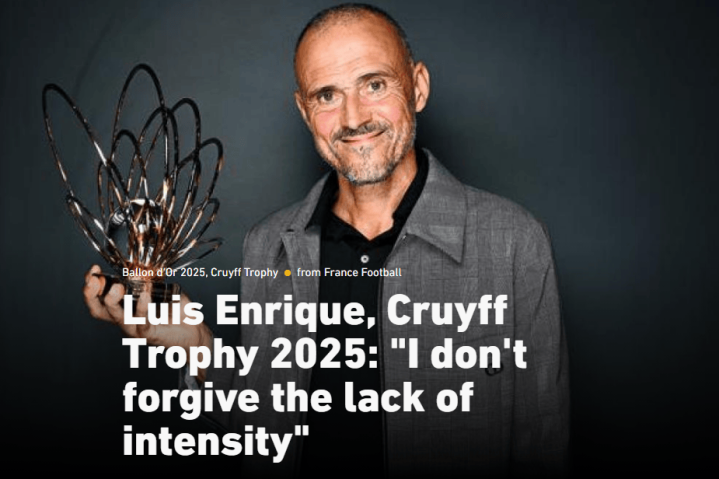 虎扑09月27日讯在拿到2025年男足克鲁伊夫奖后,法国足球撰写独家的路易斯-恩里克专栏。
