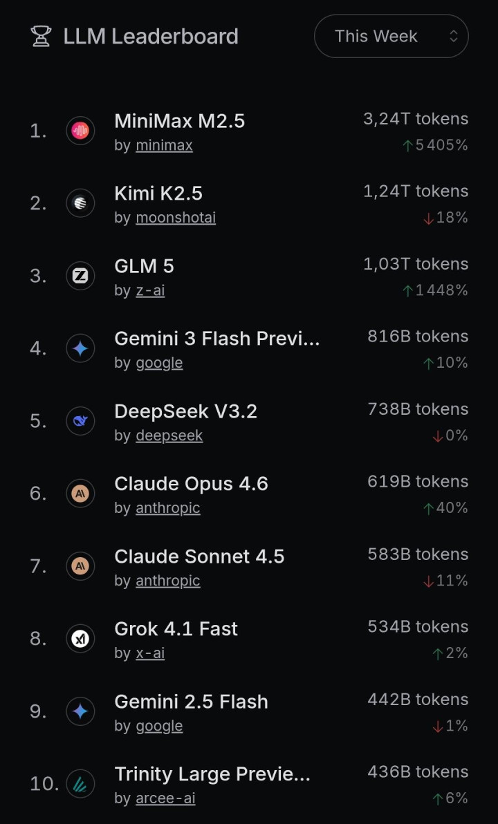 紧随其后的是月之暗面上月发布的KimiK2.5模型,以4.02万亿的Token使用量位居第二。榜单前五名中的其余席位由谷歌的Gemini3FlashPreview、深度求索(DeepSeek)的V3.2以及Anthropic的ClaudeSonnet4.5占据。